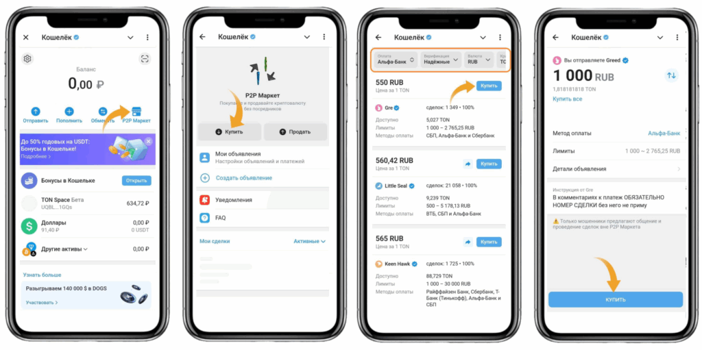 Это способ для тех, кто не любит сложные интерфейсы. Вы просто открываете кошелек @wallet в Telegram, переходите в раздел P2P и покупаете монету у других пользователей.