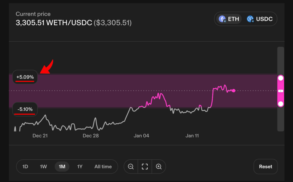 Открытие позиции на Uniswap с диапазоном: +5% вверх и -17% вниз