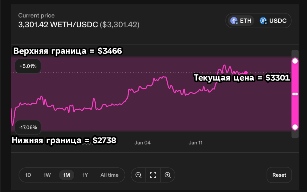 — Если цена падает ниже вашего диапазона, позиция на 100% переходит в волатильный актив (ETH).