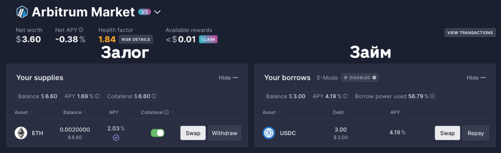 Важно следить за Health Factor и ценой ETH, чтобы вашу позицию на лендинге не ликвидировало.