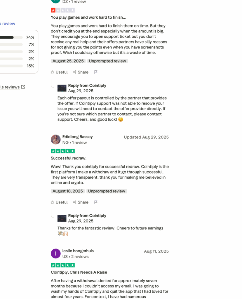 Cointiply будет интересен тем, кто хочет получать не только BTC, но и DOGE, а также ценит бонусы за активность. У проекта разные отзывы. Кто-то доволен сервисом и пользуется проектом долгое время, а кому-то замораживают деньги и просят подтвердить действия.