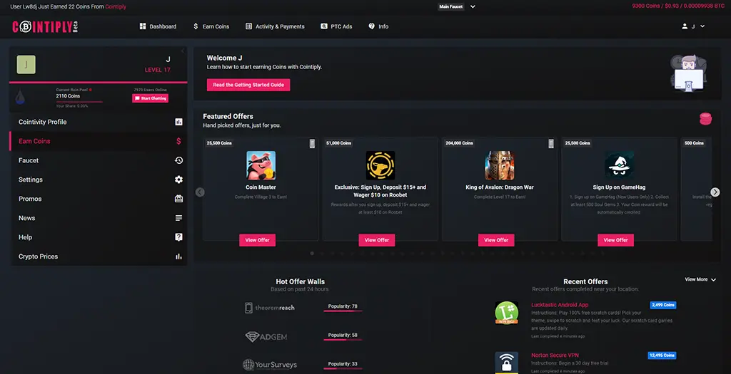 Главное отличие Cointiply — система лояльности. За активность пользователи получают очки (loyalty points), которые увеличивают размер вознаграждений. Чем чаще заходишь, тем выше бонусы. Плюс есть реферальная программа: пригласив друга, можно получать процент от его заработка.