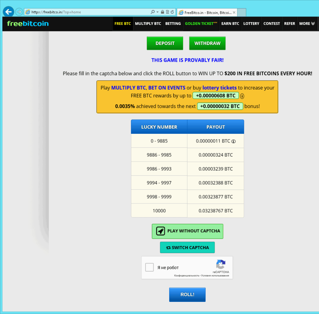 FreeBitco.in работает с 2013 года и считается самым известным краном для биткоина. Здесь награды выдаются в сатоши — минимальных долях BTC. Один сатоши равен 0,00000001 BTC, то есть сто миллионов сатоши составляют один биткоин.