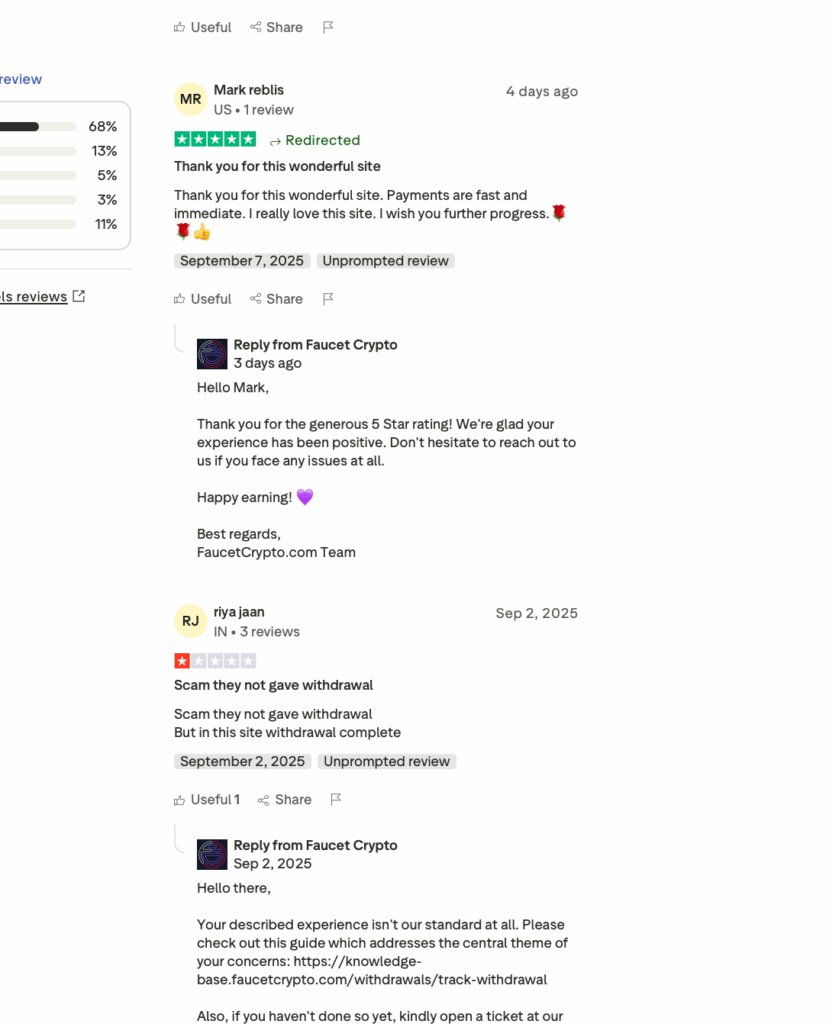 Главный плюс FaucetCrypto — гибкость. Можно собирать сразу несколько монет, быстро выводить их и тренироваться с транзакциями. Минус тот же, что и у других кранов: разные комментарии. Кто-то благодарит сервис за надежную работу и моментальные выплаты, а кто-то называет проект скамом. При этом поддержка отвечает на все негативные комментарии и предлагает решить вопрос клиента.