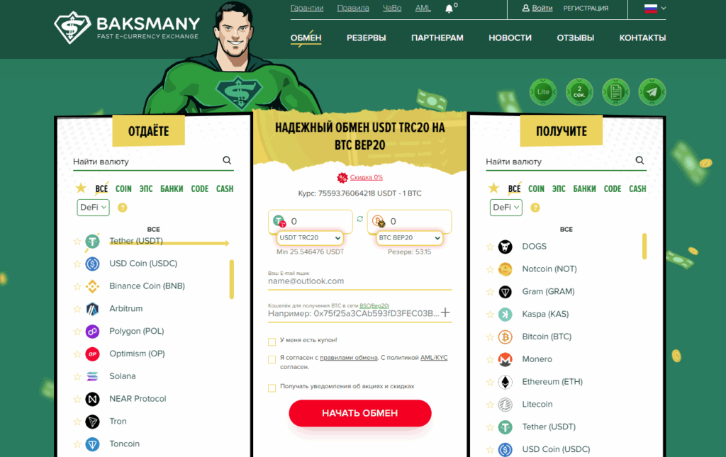 Baksmany на рынке с 2015 года и дает возможность обмена 53 криптовалют на рубли, доллары, евро или даже фунты с лирами, с массой вариантов для переводов за границу. Есть бот в Telegram для управления, и сервис под постоянным контролем BestChange, где транзакции укладываются в 15 минут без блоков. В России ценят за соответствие антиотмывочным нормам и прозрачность. Люди отмечают универсальность данного сервиса, идеальную для тех, кто много путешествует или работает с иностранцами.