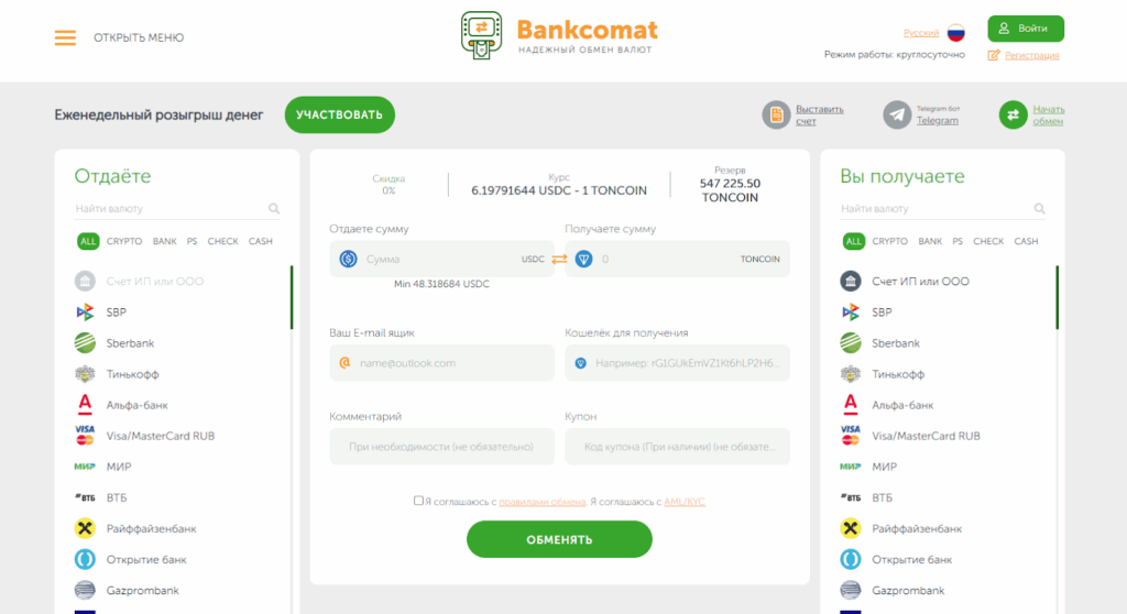 Bankcomat с 2016 года обрабатывает обмены 25 криптовалют на рубли, тенге, доллары и прочее, с ботом в Telegram для максимального удобства. Транзакции занимают 15 минут, доступны с любого гаджета, и поддержка на связи 24/7. Клиенты получают выгодные скидки за частые обмены и реферальные бонусы за приглашение друзей. В России уважают за законность и тщательные проверки. Пользователи хвалят сервис за скорость, универсальность, удобный интерфейс.