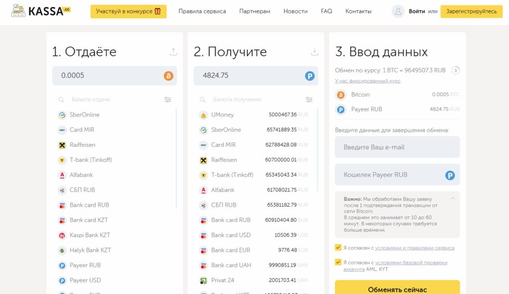 Kassa работает с 2016 года. Позволяет менять 20 криптовалют на рубли, доллары, евро. Криптовалютный обменник имеет удобный интерфейс, в котором легко разобраться. Поддержка 24/7, тысячи отзывов на BestChange об удобстве и доверии. Популярен за скорость и отсутствие скрытых комиссий. Идеален для новичков с минимумом требований. В России хвалят за стабильность и законность.
