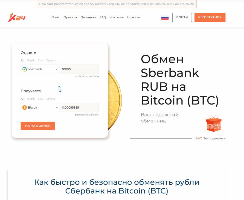 Kursov24 с 2020 года предлагает обмен 40 монет на рубли с реферальной программой до 0,6%. Ценится за качество сделок, скорость транзакций и отзывчивую поддержку, работающую 24/7. Выгоден для заработка на приглашениях новых людей, который буду активно использовать сервис. В России ценят за современность и законность.