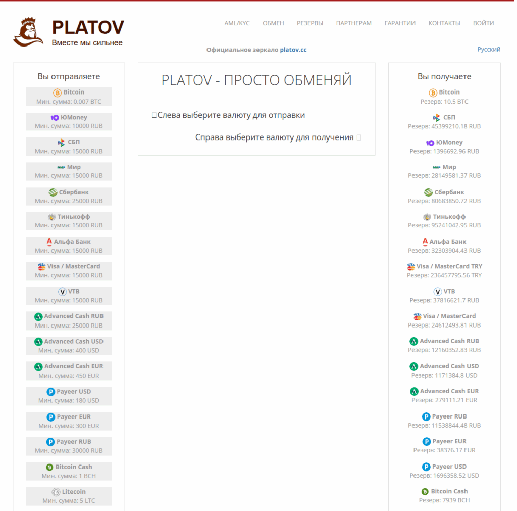 Platov с 2017 года позволяет обменивать 39 монет на рубли, лиры, евро с курсами в реальном времени. Проверен на BestChange, пользователи отмечают большой выбор криптовалют, скорость сделок без задержек, а также удобный интерфейс. В России уважают за надежность и прозрачность сделок.