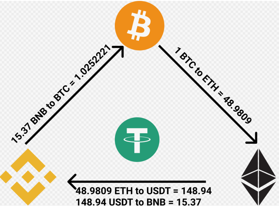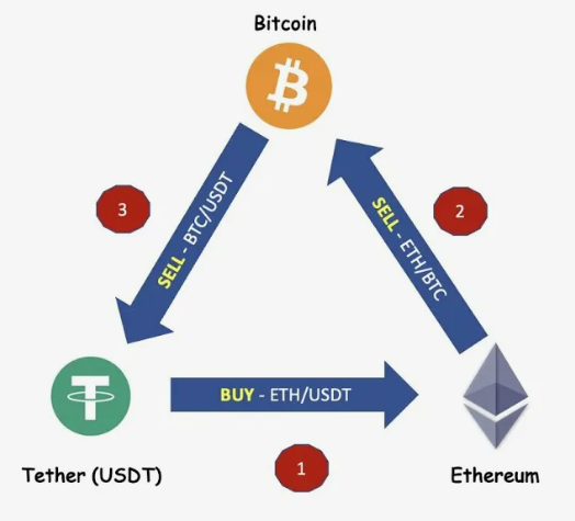 Интересный вариант, когда вы используете три актива для заработка. Покупаете одну криптовалюту за фиат, затем обмениваете ее на вторую, а вторую – на третью, и, наконец, третью продаете обратно за фиат, получая прибыль от цикла.