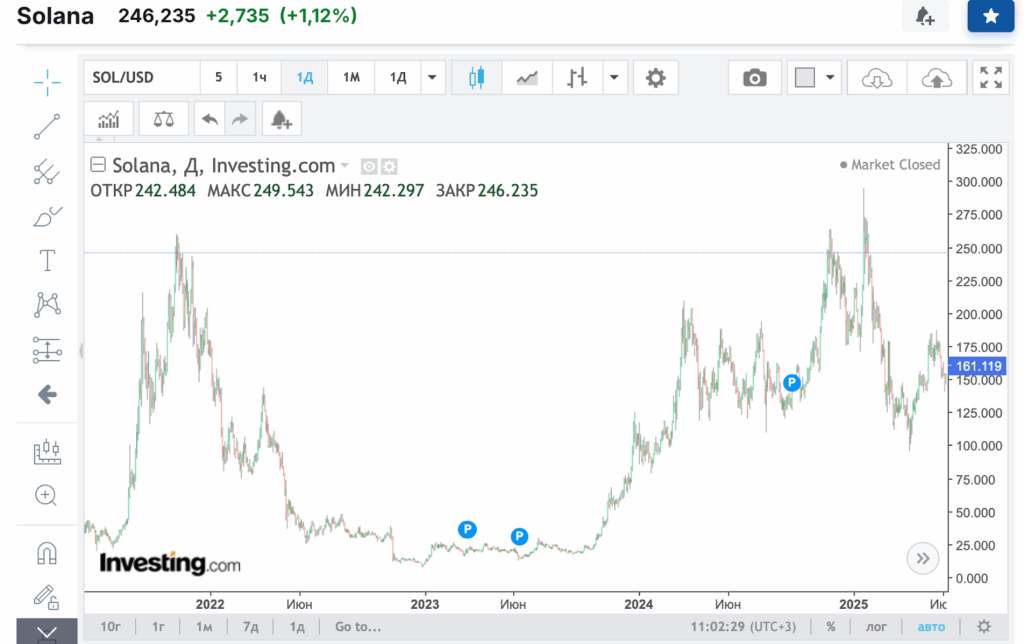 В 2020 году крипта SOL стоила примерно $1, в 2021 курс криптовалюты Солана начал расти и достиг $260. В 2022-2023 цена резко упала из-за падения медвежьего рынка и проблем в экосистеме.