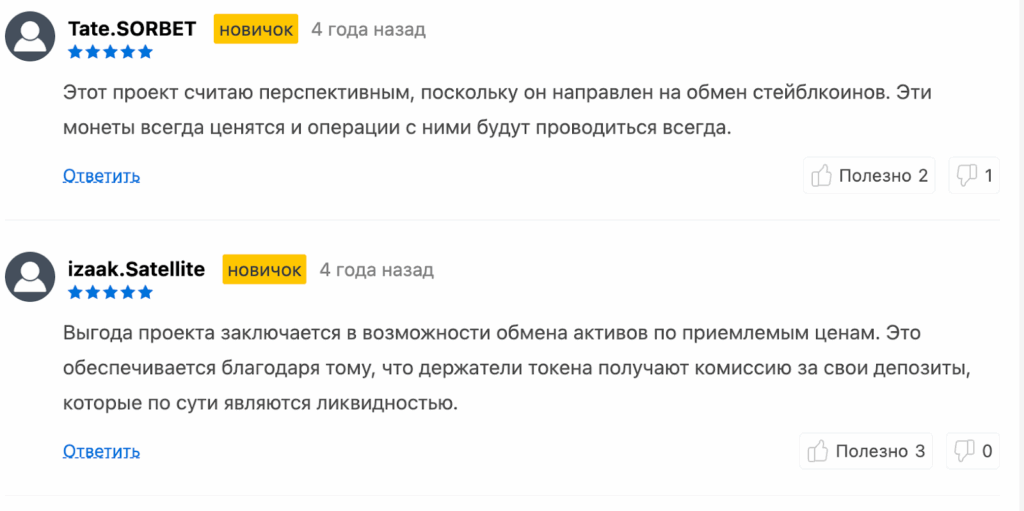 В отзывах люди пишут, что проект дает возможность обменивать стейблкоины с небольшими комиссиями.