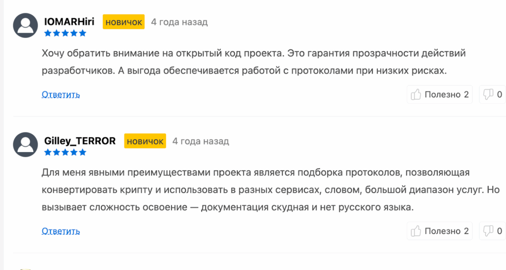Репутация у проекта хорошая. Комментаторы отмечают открытый код проекта, который повышает уровень доверия, и наличие протоколов для конвертации криптовалюты. Из минусов — недостаток документов и русского языка.
