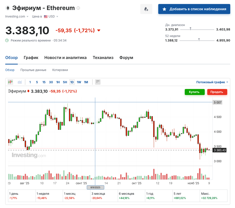 Прогноз Эфириума на сегодня — рынок развивается под влиянием макроэкономических факторов и внутренних улучшений протокола. По состоянию на начало ноября 2025 года стоимость одной монеты около 3390 долларов. Преобладает нисходящий тренд, поддерживаемый негативными фундаментальными новостями и низким институциональным интересом.