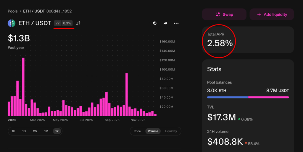 На многих типичных V2-пулах комиссия составляет 0.3%. Давайте рассмотрим на примере пула ETH/USDT на одном из самых популярных DEX — Uniswap.