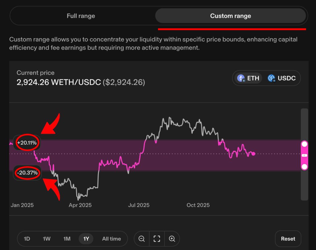 Например, если от текущей цены до нижней границы всего 1% движения, а до верхней 20%, то ваша позиция будет состоять на 95% из ETH и 5% из USDC.