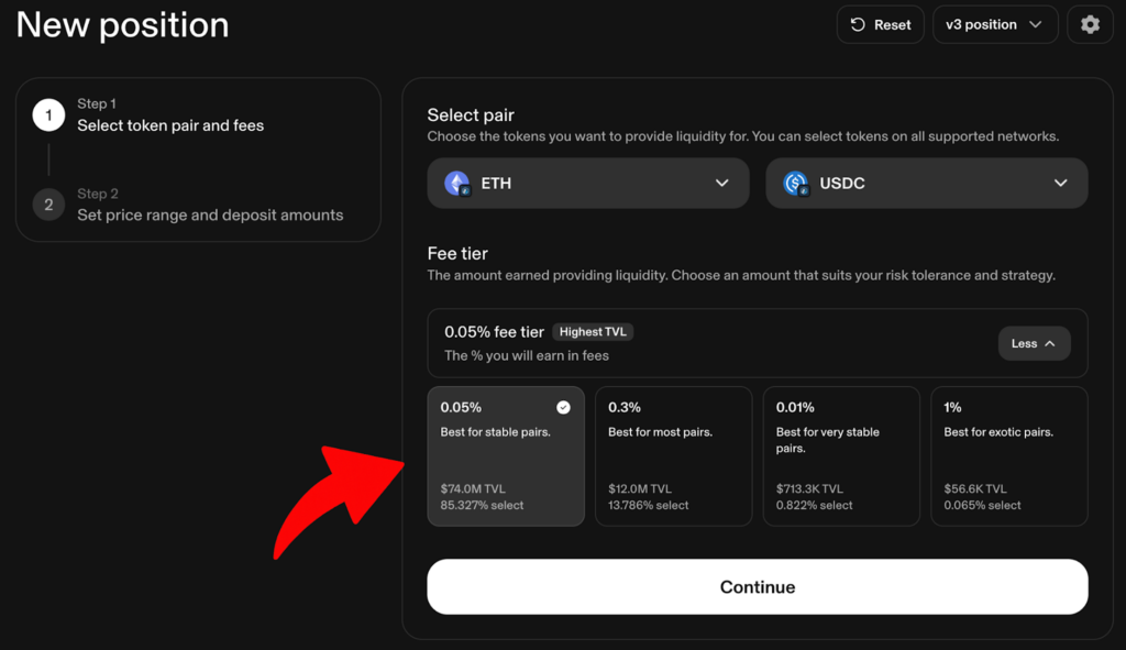 На Uniswap всегда будет предлагаться тир комиссий, в котором находится больше всего TVL (Total Value Locked). В нашем случае с ETH/USDC — это 0.05%.